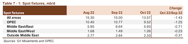 The latest estimates show global spot fixtures declined in October to average 13.6 mb/d. Fixtures fell by 1.4 mb/d, or almost 10% m-o-m. Compared with the previous year, spot fixtures were down by 2.2 mb/d or almost 14%. OPEC spot fixtures fell in October, averaging 9.5 mb/d. This represents a m-o-m loss of around 1.3 mb/d, or more than 11%. In comparison with the same month in 2021, fixtures decreased by around 0.4 mb/d, or more than 4%. Middle East-to-East fixtures declined by 0.7 mb/d, or almost 11%, to average 5.9 mb/d. However, compared with the same month last year, eastward flows from the Middle East were still about 0.3 mb/d, or almost 4%, higher. Spot fixtures from the Middle East-to-West fell further in October, down by around 0.2 mb/d, or 15% m-o-m, to average around 1.3 mb/d. Y-o-y, rates were about 5% lower. Outside the Middle East, fixtures averaged 2.3 mb/d. This represents a loss of 12%, or about 0.3 mb/d, m-o-m and a decline of 0.6 mb/d, or almost 21%, y-o-y.