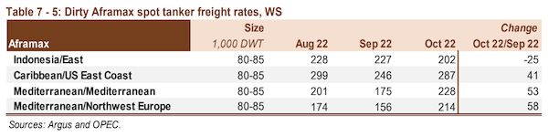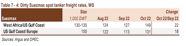 Suezmax rates recovered in October from the slight decline seen the previous month, gaining 17% m-o-m. Rates remained supported by ongoing trade dislocations, which boosted demand for longer-haul voyages in the Suezmax class. Compared with the same month last year, they were considerably higher, up 126%. Rates on the West Africa-to-US Gulf Coast (USGC) gained 17% to average WS149 points. Compared with the same month last year, they were 129% higher. Spot freight rates on the USGC-to-Europe route rose 16% compared with the previous month to average WS131 points. Y-o-y, rates were 122% higher.