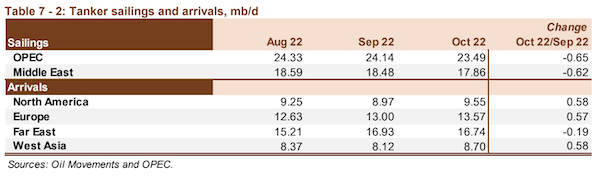 OPEC sailings fell by around 0.7 mb/d, or around 3%, m-o-m in October to average 23.5 mb/d, but were 1.1 mb/d, or about 5%, higher compared with the same month a year ago. Middle East sailings decreased by around 0.6 mb/d, or more than 3%, in October to average 17.9 mb/d. However, y-o-y, sailings from the region rose by about 1.1 mb/d, or around 7%, compared with October 2021.