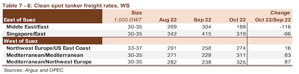 Clean spot freight rates continued to experience mixed performance, this time with East of Suez rates contributing to losses, while West of Suez rates saw gains. On average, rates declined by 2% m-o-m in October but were still up 114% compared with levels seen in the same month last year.